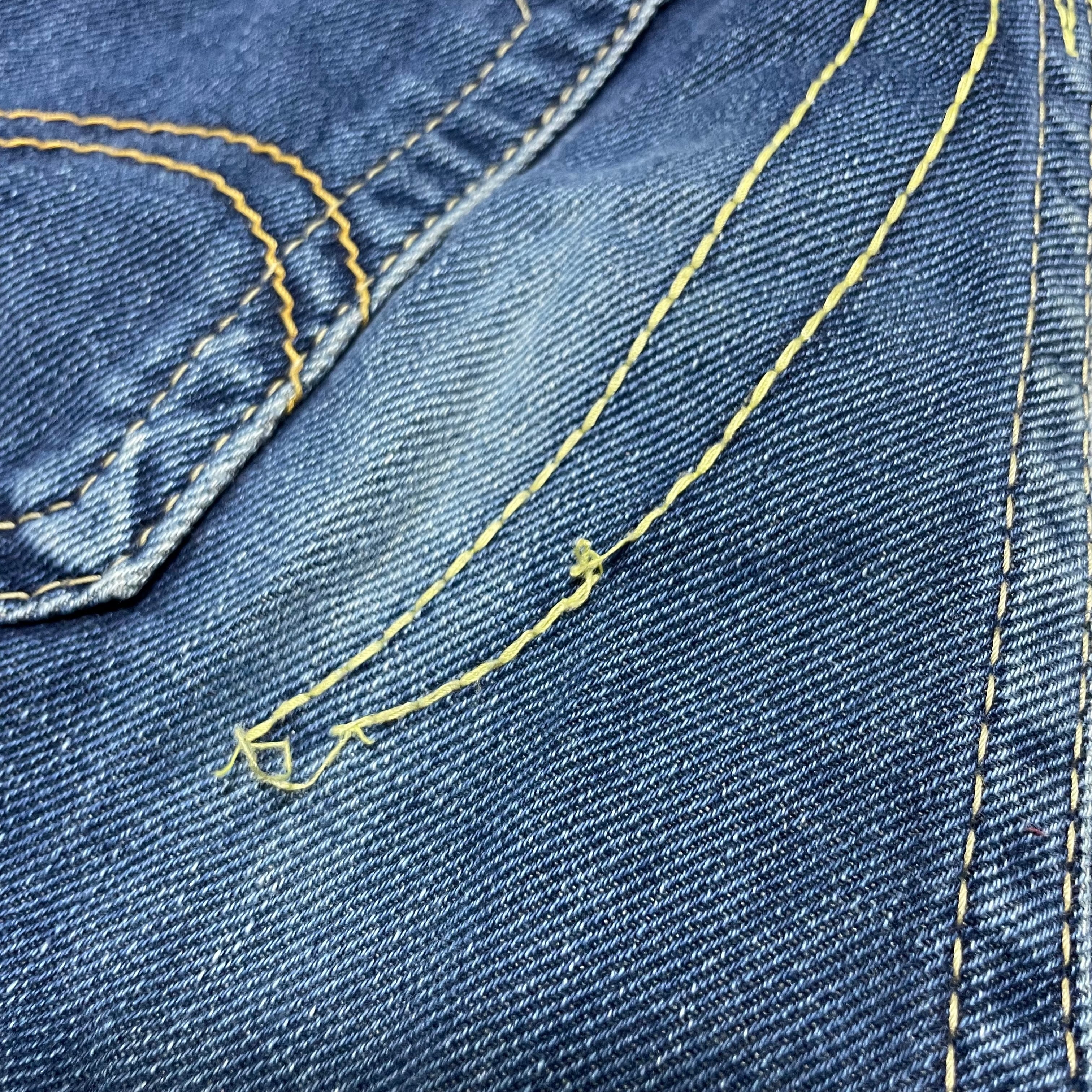 ヒップから膝周りを取り囲むようなイエローステッチが目をひく個性的な一本。